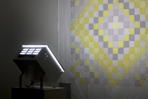 Sunshine and Shadow (Winter Quilt), hand-dyed using Alaskan wildflowers and berries, hand-pieced and hand-quilted cotton, glow-in-the-dark thread, SAD light, 74" x 74" x 3', 2015